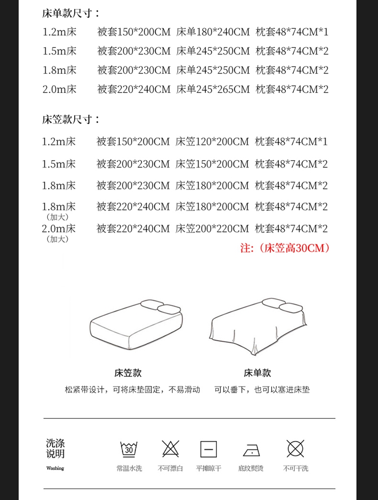 • 被套200X230;床笠180X200;枕套48*74*2